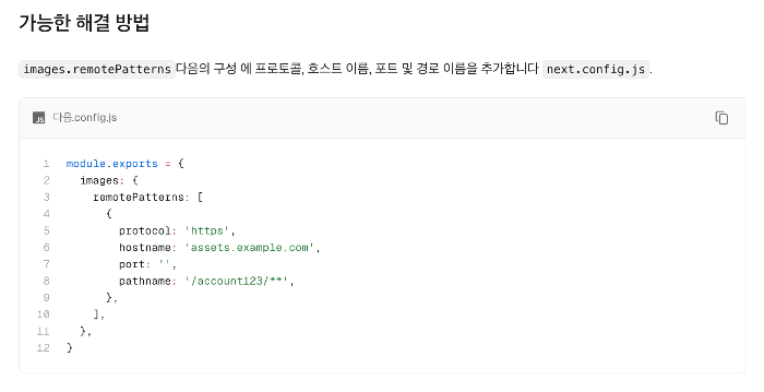 config 파일에 remotePatterns 프로퍼티를 구성해줘야 하는데,